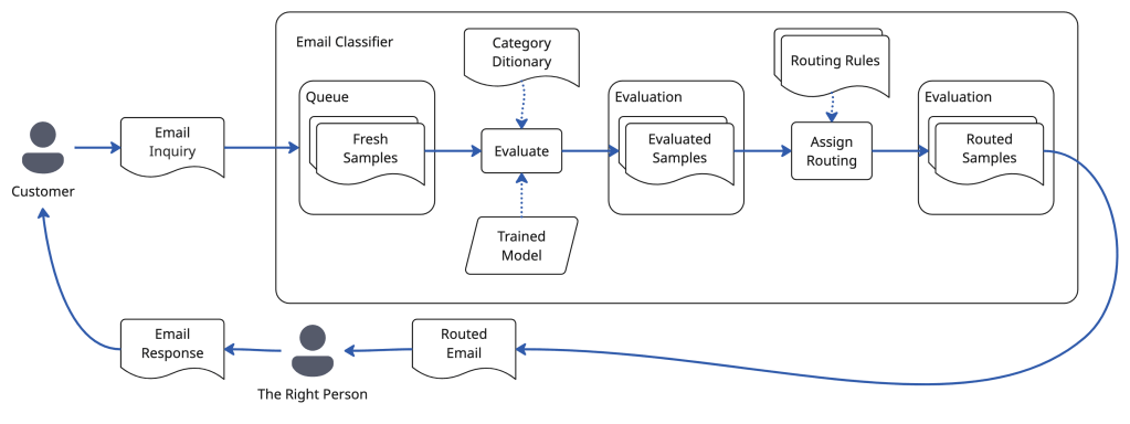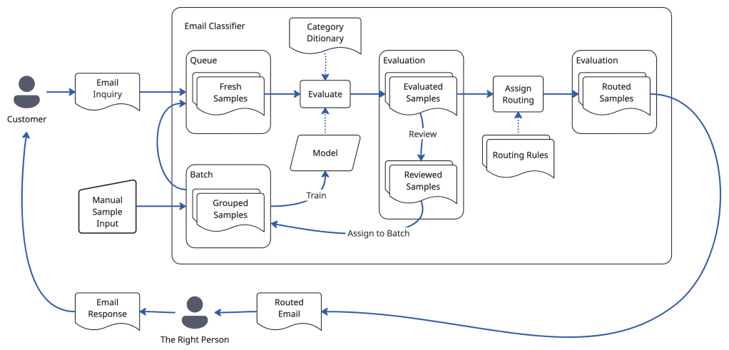 When an email comes into the app, it becomes a sample. The app uses batches to allow the user to organize samples. The queue is a special batch that contains all the samples that are ready to be processed by the model. The app performs evaluation runs, handing the samples in the queue to the inference pipeline, where the model evaluates the samples, assigning classifications. The evaluated samples are moved to an evaluation batch, where routing rules can be applied, to determine whom to send the email to.